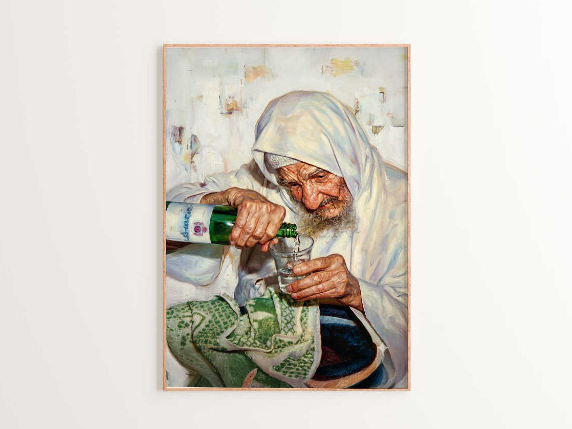 תמונה אמנותית מרגשת המציגה את הבאבא סאלי זיע״א ברגע פשוט ומלא משמעות. בציור בסגנון מאויר נראה הצדיק עטוף בגלימתו הלבנה, כשהוא מוזג בעדינות ערק לכוס קטנה. פניו המאירות והחרושות קמטים מבטאות חכמה, ענווה ועומק של שנים, ומעניקות לתמונה תחושה של קדושה ופשטות של צדיק אמת.
