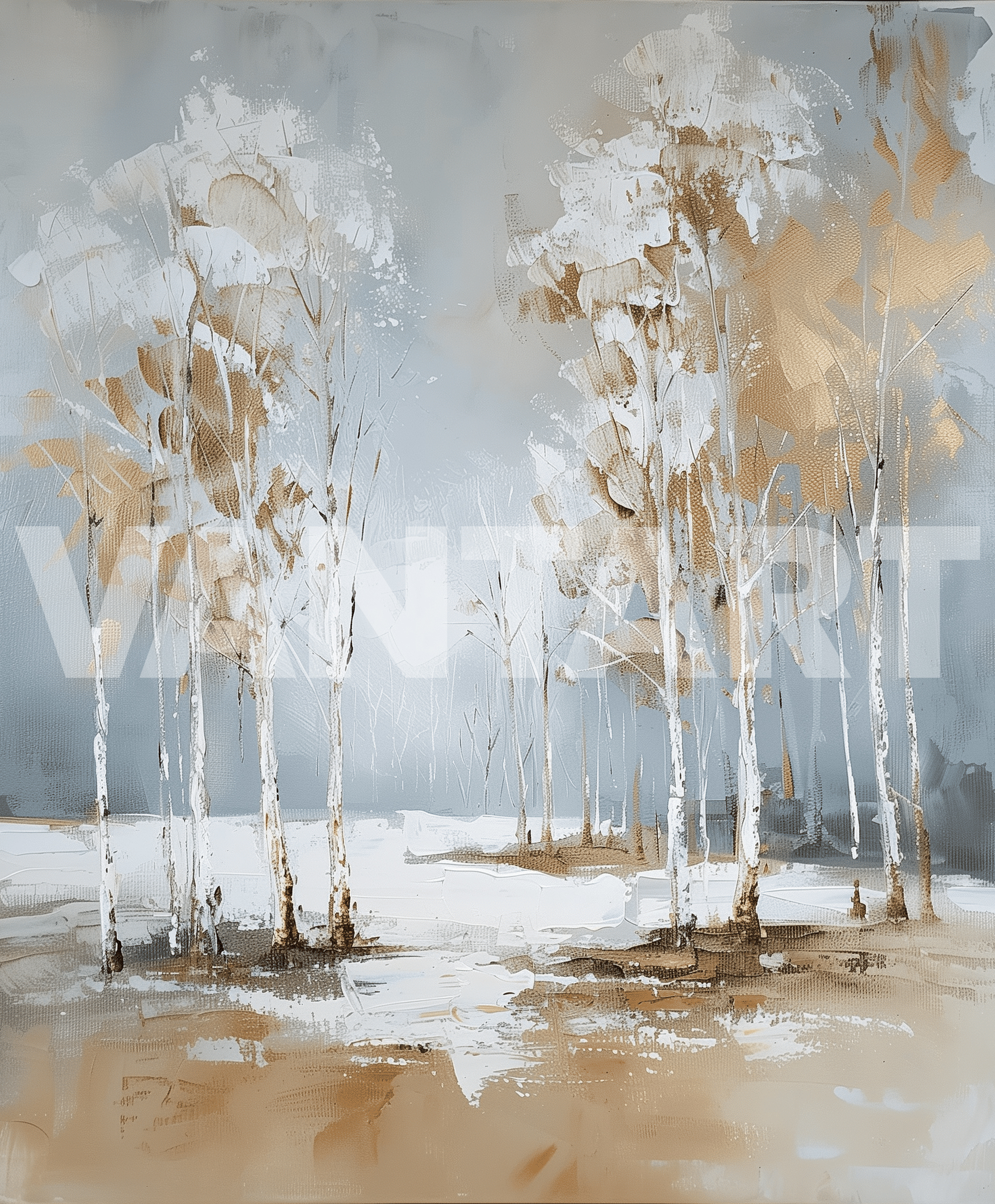 תמונה פסטורלית ומרגיעה המציגה יער חורפי שקט, שבו עצים לבנים דקים נישאים אל רקע ערפילי בגווני תכלת אפרפר ובז’ רך. טכניקת הציור מחוספסת אך מאוזנת, ויוצרת תחושת עומק וקרבה לטבע עוטף ושקט. העלים הלבנים מתמזגים ברכות עם האור, ומעניקים לצופה תחושת רוגע, נשימה עמוקה וניקיון פנימי כאילו העולם עוצר לרגע.