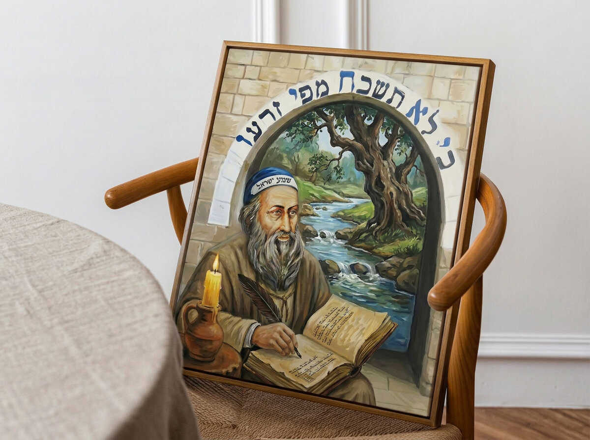 יצירה אמנותית מרגשת המציגה את דמותו הקדושה של רבי שמעון בר יוחאי זיע״א, מגדולי התנאים ומחבר ספר הזוהר הקדוש. בציור נראה הצדיק שקוע בכתיבת דברי תורה לאור הנר, כאשר לפניו ספר פתוח ופניו המאירות משדרות עומק רוחני ודבקות בתורה.